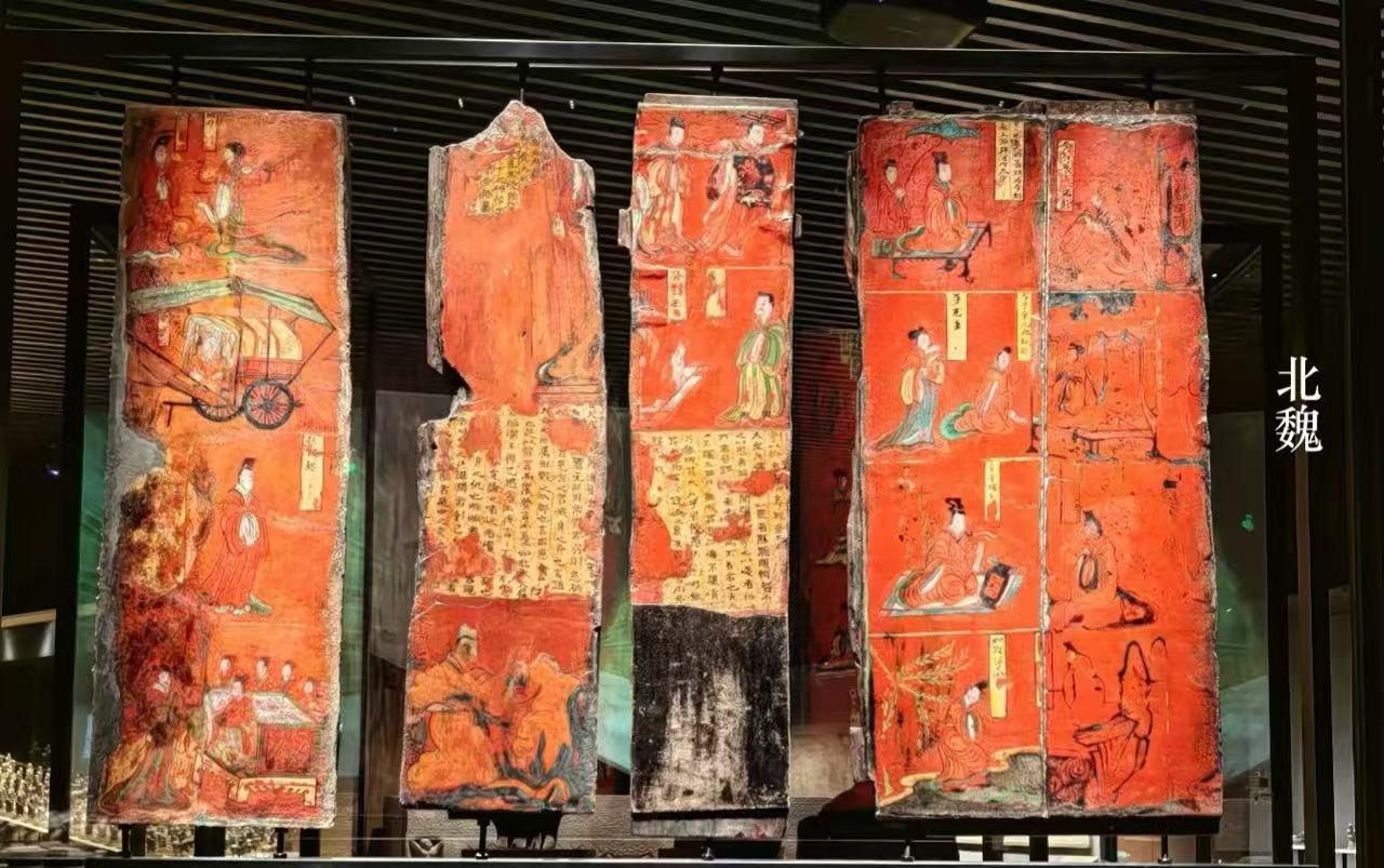 The lacquer screen from Sima Jinlong’s tomb, which is rare and special. This screen has five wooden panels with lacquer. Each panel shows the skill of Northern Wei workers and their methods.