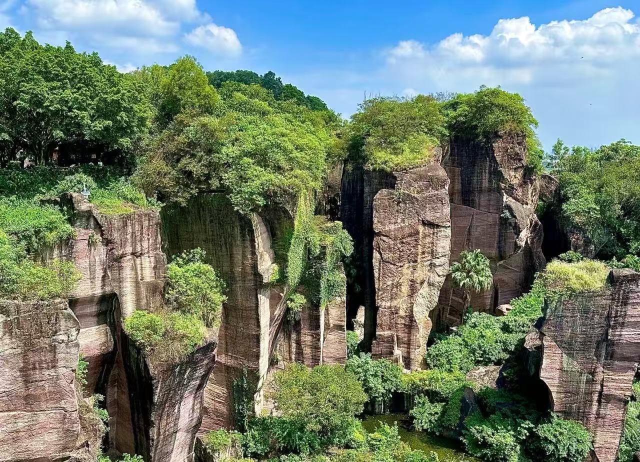 Guangzhou lotus hill is in the east part of Panyu District. It is about 20 kilometers away from downtown Guangzhou. The tourist resort covers 2.54 square kilometers. There are 48 small red sandstone hills here. The tallest hill is 108 meters high. The area is known for its steep cliffs, caves, and water spots. These were made by old stone mining. Long ago, it was a quarry during the Western Han Dynasty. You can still see caves and grottoes from over 2,000 years ago. Here’s a quick look at what makes lotus hill resort special: