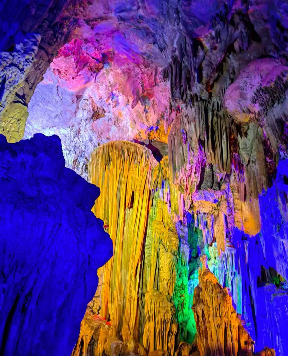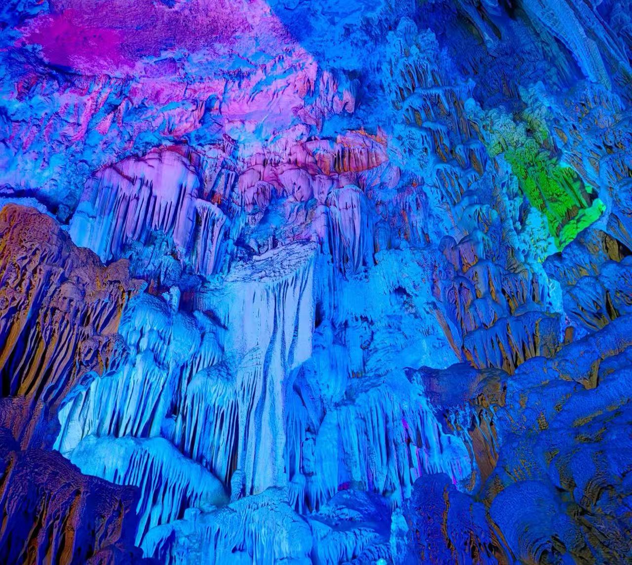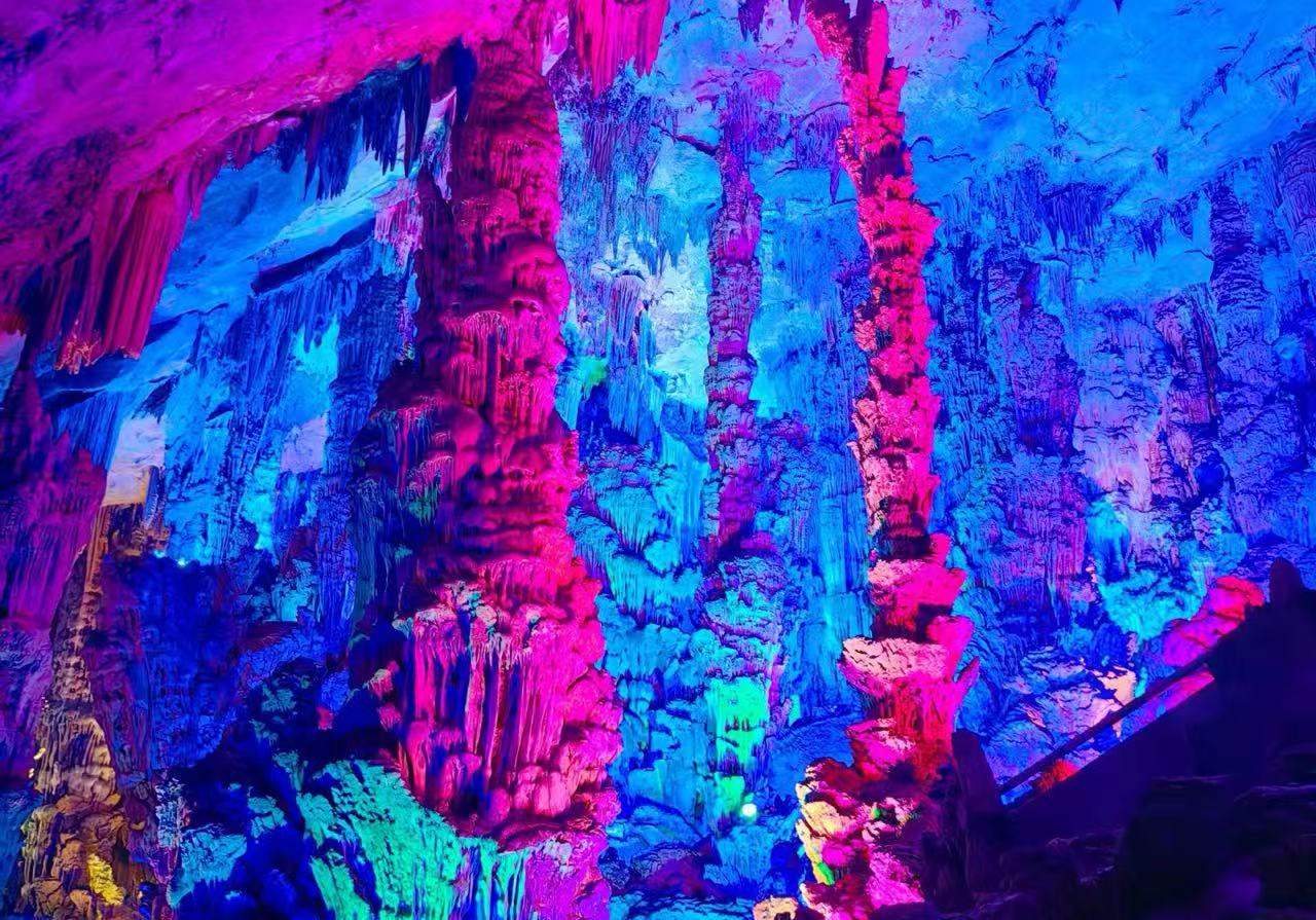 When you walk into Reed Flute Cave, it feels magical. The cave is made of limestone and is famous with tourists. Huge rock shapes fill the cave and look amazing. Water has changed the cave for millions of years. It made cool stalactites, stalagmites, and stone columns. Colorful lights shine on these rocks and make them look bright. The lights reflect off the stones and show off their shapes. You can see reflections in the pools underground. No other cave in China looks like this one. The mix of rocks and lights makes every trip special.