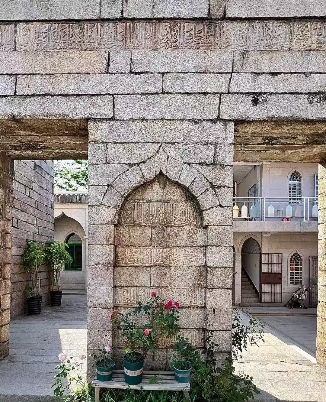 Inside the qingjing mosque, you find more than just beautiful halls. You see history come alive through old objects and displays. The mosque is the oldest example of Moslem architecture in China. It was built in 1009. In the main prayer hall, you spot a stone with Arabic writing. This is a piece of the Koran, carved long ago. It is still easy to read today.