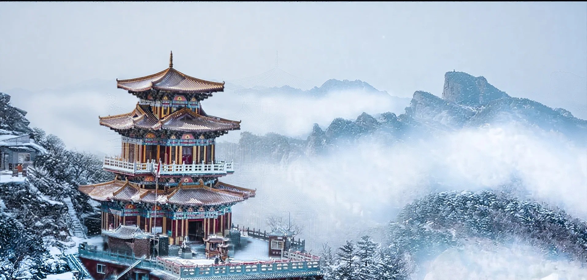 You see waterfalls and clouds everywhere. There are old temples from the Tang Dynasty. The scenery changes with each season. Spring brings wildflowers. Summer is green and full of life. Autumn has golden leaves. Winter covers the peaks with snow.