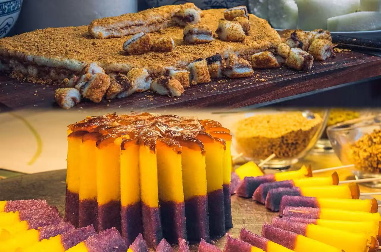 Eight Treasure Rice Mirror Cake: You see colorful rice cakes topped with nuts and dried fruit. The texture is soft and sweet.