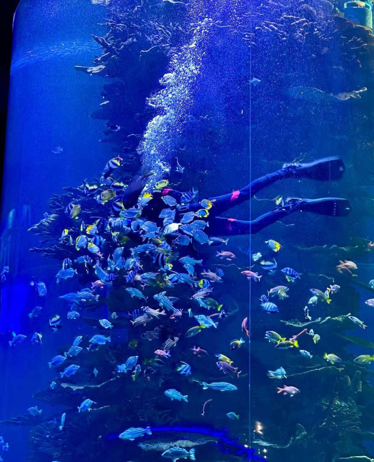 Live shows make your visit exciting. Mermaids swim in the water, and divers dance with sharks. The performance hall has underwater ballets and other fun events. These shows happen all day, so check the times when you arrive.