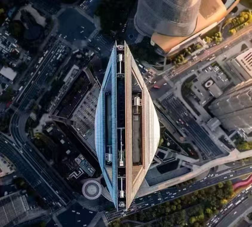 Jin Mao Tower stands right next door. This skyscraper has a unique design and is easy to spot.