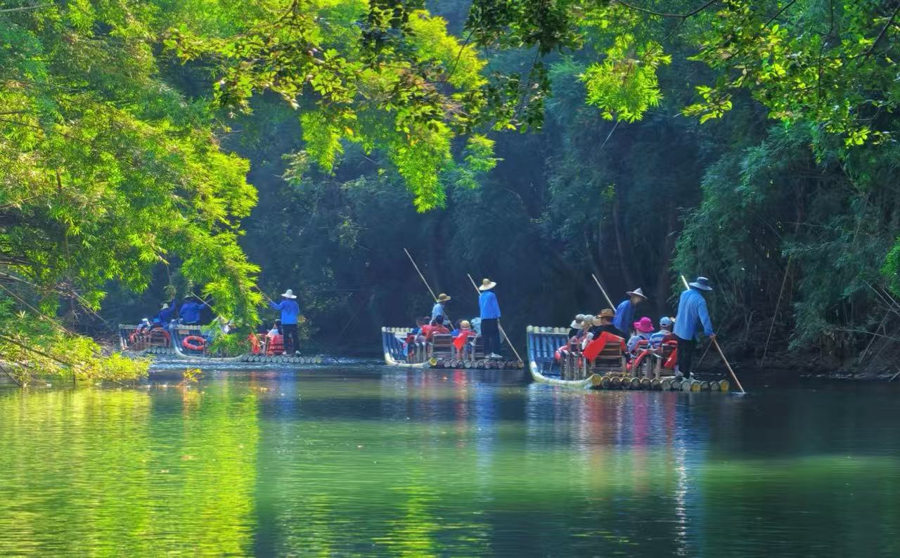 You stand on the edge of the nine-bend stream in wuyi mountain, feeling the cool morning air. Locals invite you to try bamboo rafting on the nine bend river. You step onto a raft made from thick bamboo poles. The guide, a local expert, pushes off with a long pole. The nine-bend stream flows gently at first. You glide past green forests and tall cliffs. The water sparkles under the sun. The guide shares stories about the nine bend river and the history of wuyi mountain. You hear legends about ancient scholars and see carvings on the rocks.